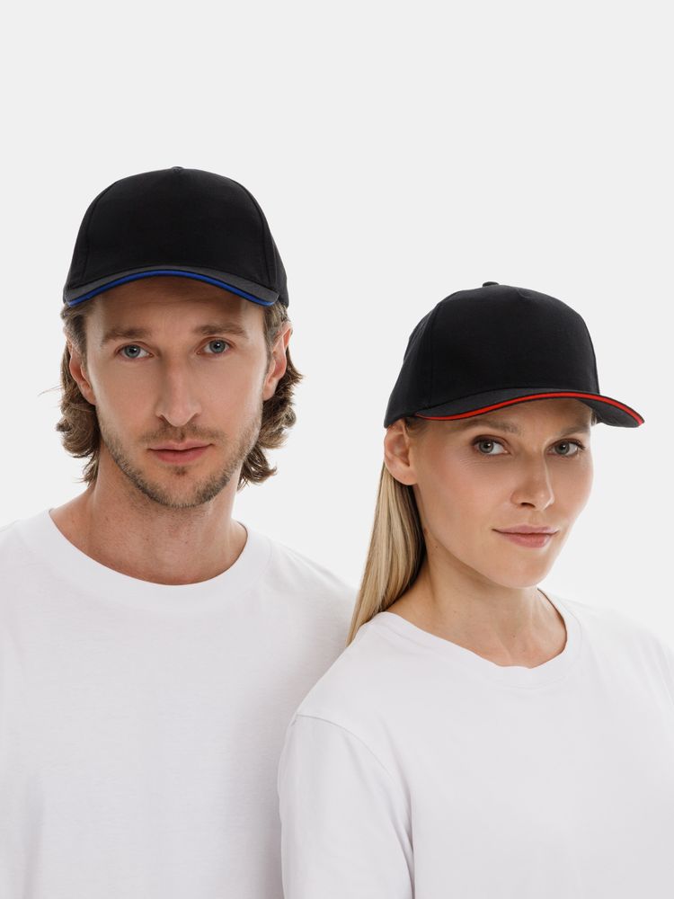 Модель бейсболки с 5-ю клиньями без лобового шва из плотного чесаного хлопка.