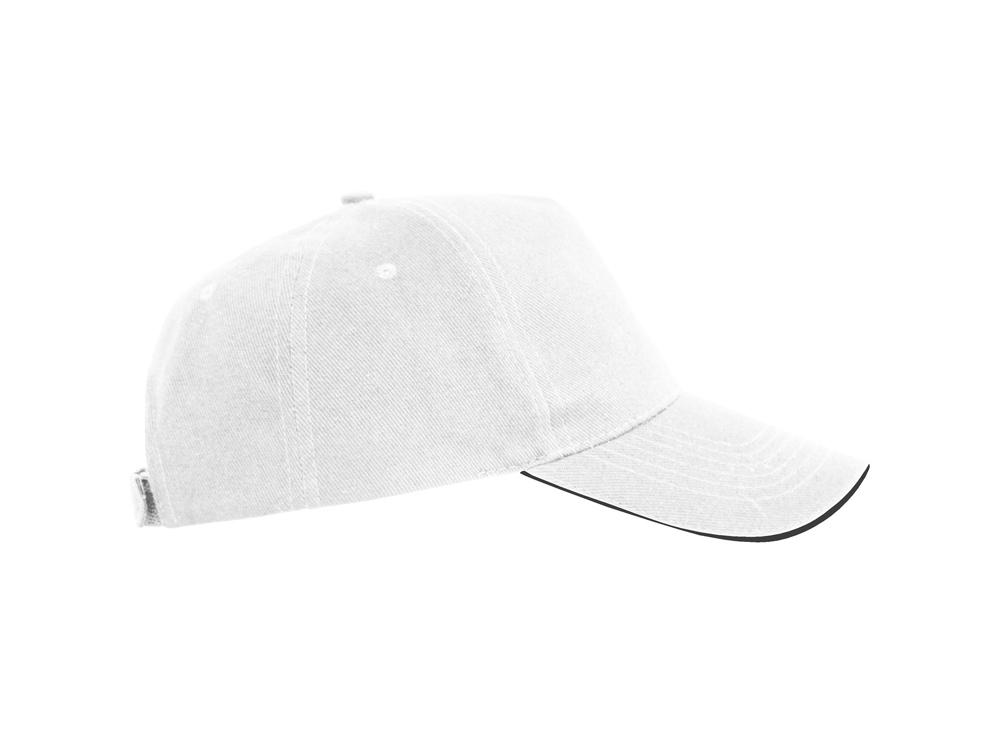 Бейсболка из 5 панелей с контрастным сэндвичем. Четыре вышитых вентиляционных люверса. Застежка на липучку.
