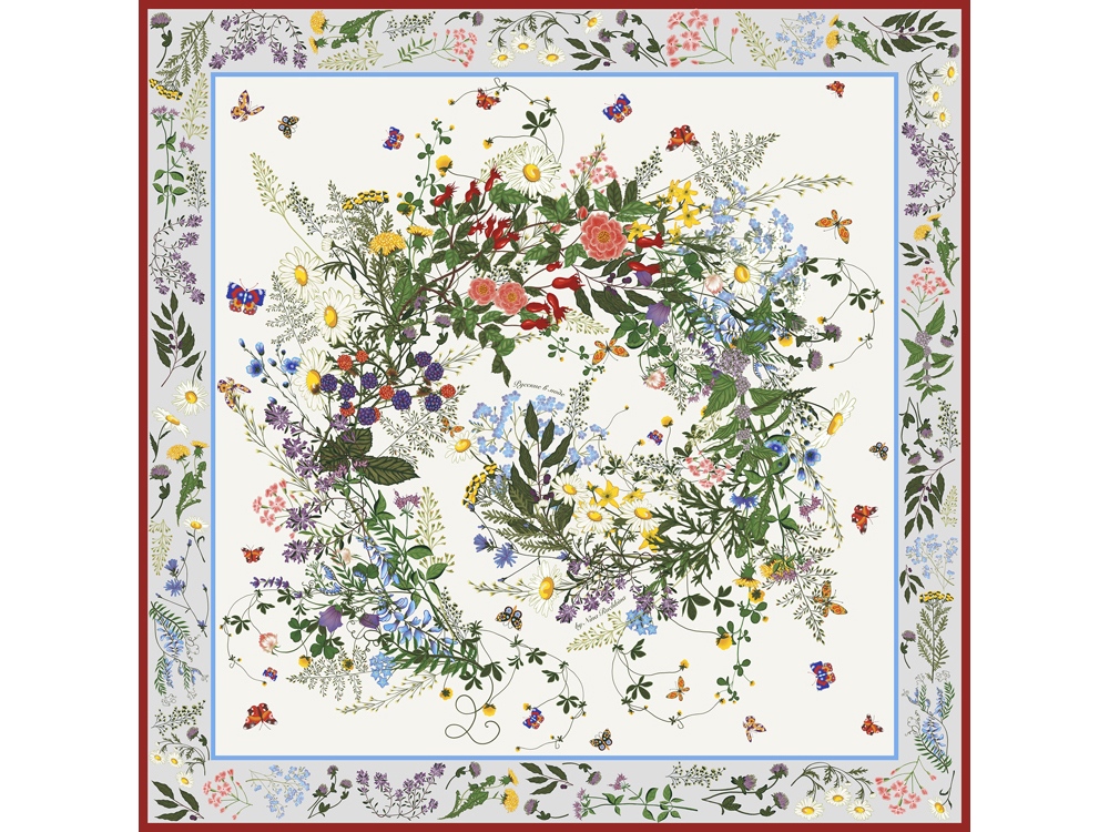Яркое благоухающее разноцветье русского полевого букета воплощено в шелковом платке, где собраны изображения более 20 цветов и трав. Чудесные незабудки и ромашки, нежные васильки, пышный клевер образуют полукруг венка с вплетенными листьями лавра, чабреца, мяты. Пудровый тон фона создает ощущение простора и воздуха, а контрастная окантовка делает драпировку платка особенно эффектной. Красноречивее слов, цветы способны рассказать о многих чувствах. Платок Русский полевой букет станет выражением любви, олицетворением изящества и источником радости. Над дизайном работали: Нина Ручкина, Ксения Ковражкина
