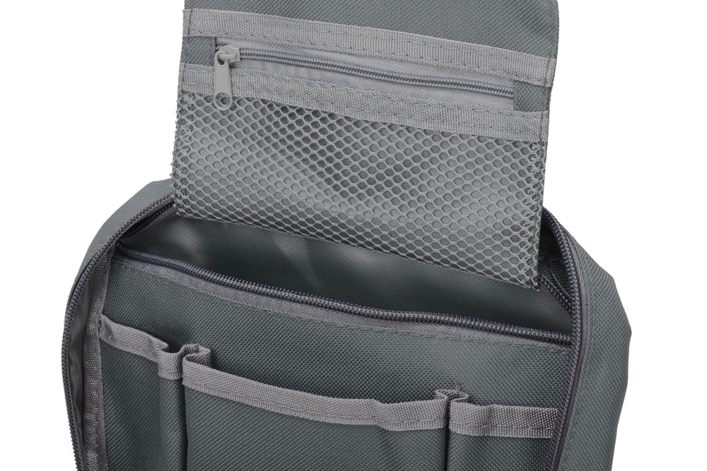 Несессер для путешествий – неотъемлемый атрибут комфортных поездок, служащий для компактного хранения различных мелочей. Аксессуар также пригодится для походов в спортзал и просто поддержания порядка дома. Это превосходный подарок любителю путешествий, а также отличный вариант промо-презента для рекламных кампаний. Большая поверхность позволяет нанести логотип или слоган фирмы. • Вместительное пространство с двумя большими отделениями и несколькими карманами дает возможность эргономично распределить весь дорожный арсенал косметических и туалетных принадлежностей. • Крючок позволяет подвесить аксессуар, например, в уборной поезда или гостиничном номере, в случае отсутствия полки. • Оптимальные размеры, не превышающие формат А4, позволяют легко разместить несессер в любом чемодане или дорожной сумке.