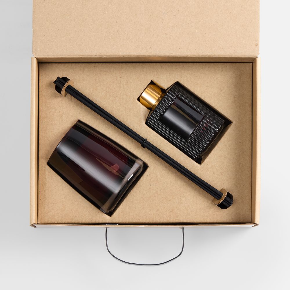 • Материал: флакон, подсвечник - стекло, палочки из файбера; свеча - воск; коробка - микрогофрокартон