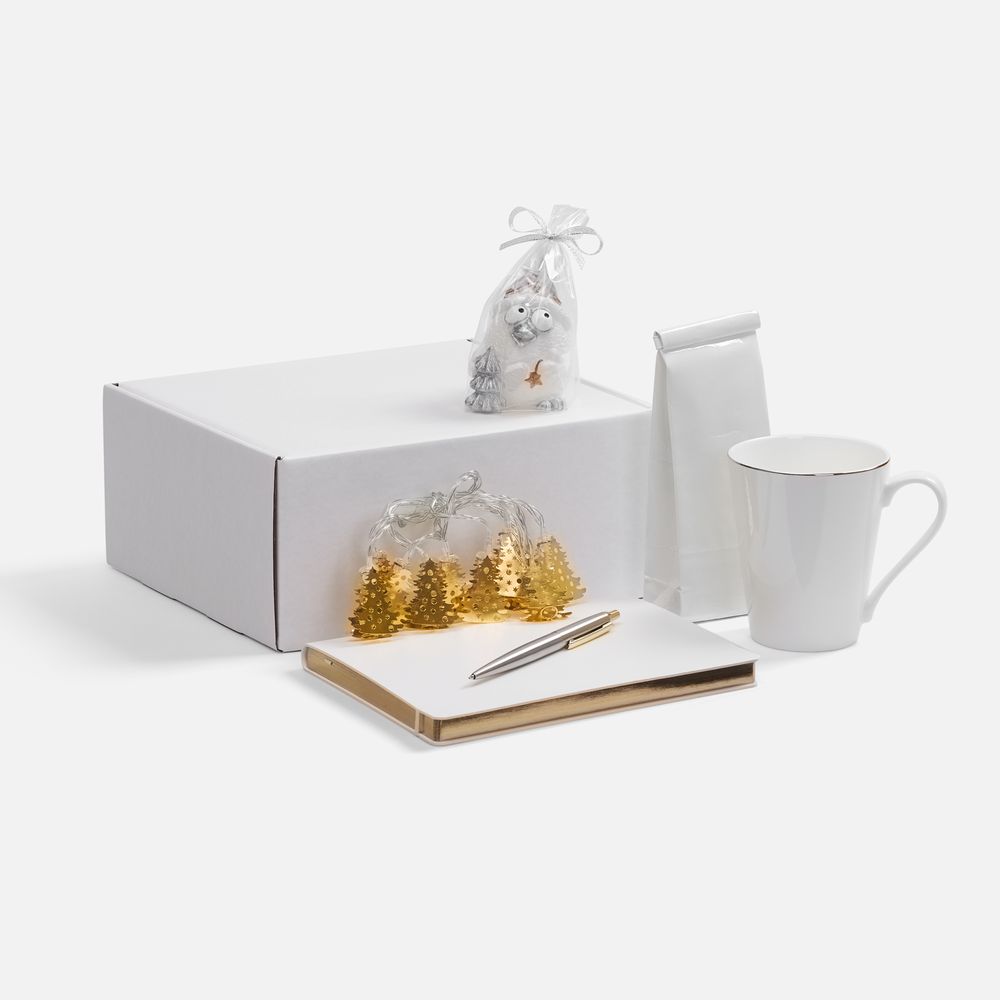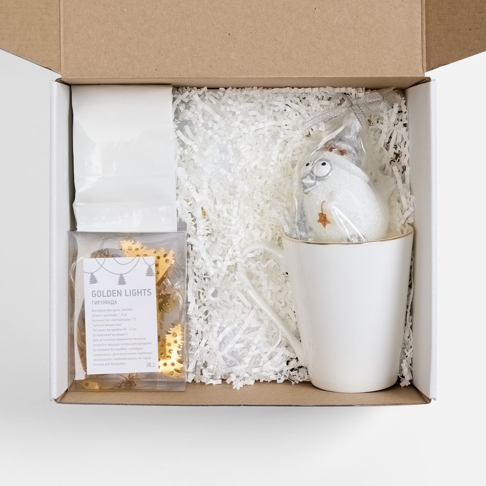 - Материал: кружка - костяной фарфор; гирлянда - пластик, металл; свеча - парафин; ежедневник - искусственная кожа; ручка - металл