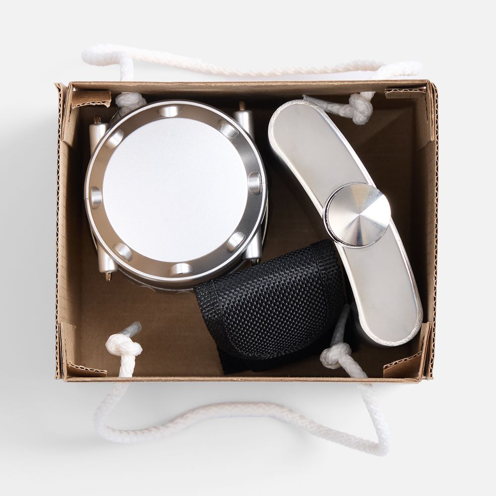 • Материал: мультитул - нержавеющая сталь; алюминий; фляжка - нержавеющая сталь, 304; фонарь - АБС-пластик; коробка - микрогофрокартон