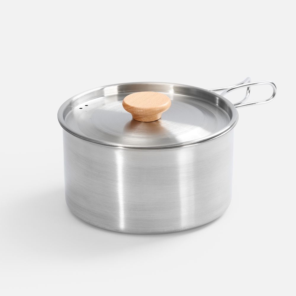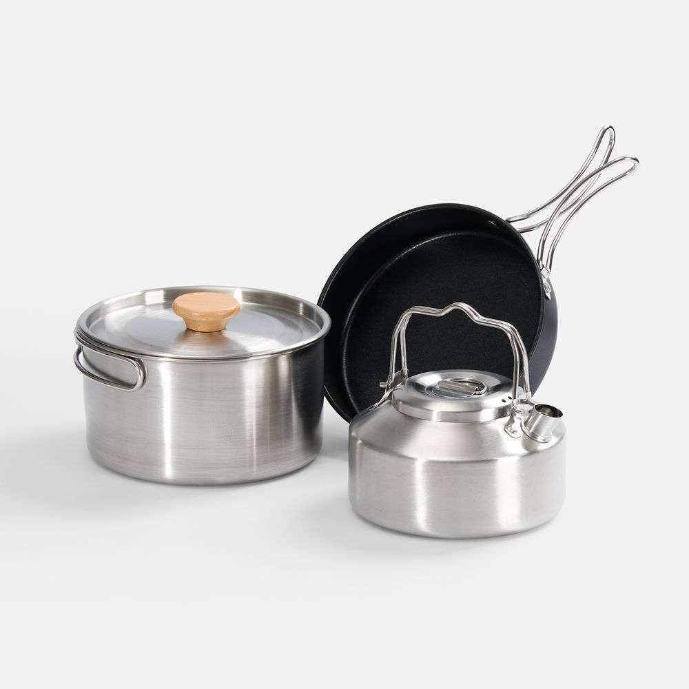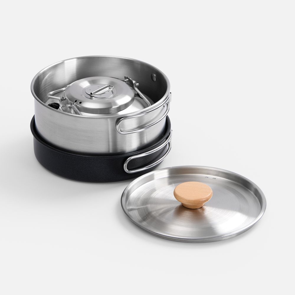 Продуманный дизайн набора позволяет сохранять место в походном рюкзаке: посуда со складными ручками компактно упаковывается во входящий в комплект сетчатый чехол.