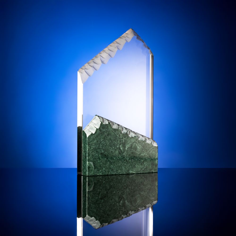 Помимо красивейшего змеевика, награда изготовлена из стекла К9, в основе которого лежит оптическое боросиликатное стекло. Эту марку стекла отличает низкий процент посторонних включений, высокий показатель преломления и высокая прозрачность — идеальные качества для изготовления наград премиального уровня.