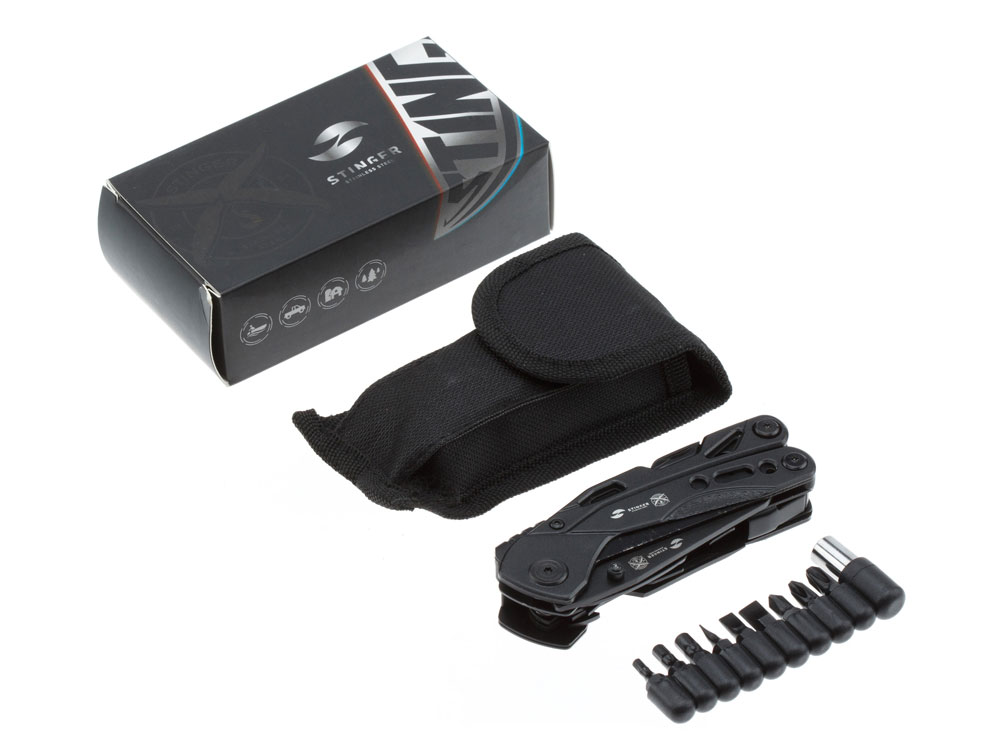 Мультитул Stinger, 105x45 мм, 13 функций, сталь, чёрный, в комплекте 9 насадок и нейлоновый чехол