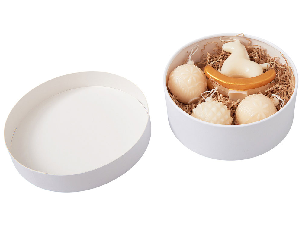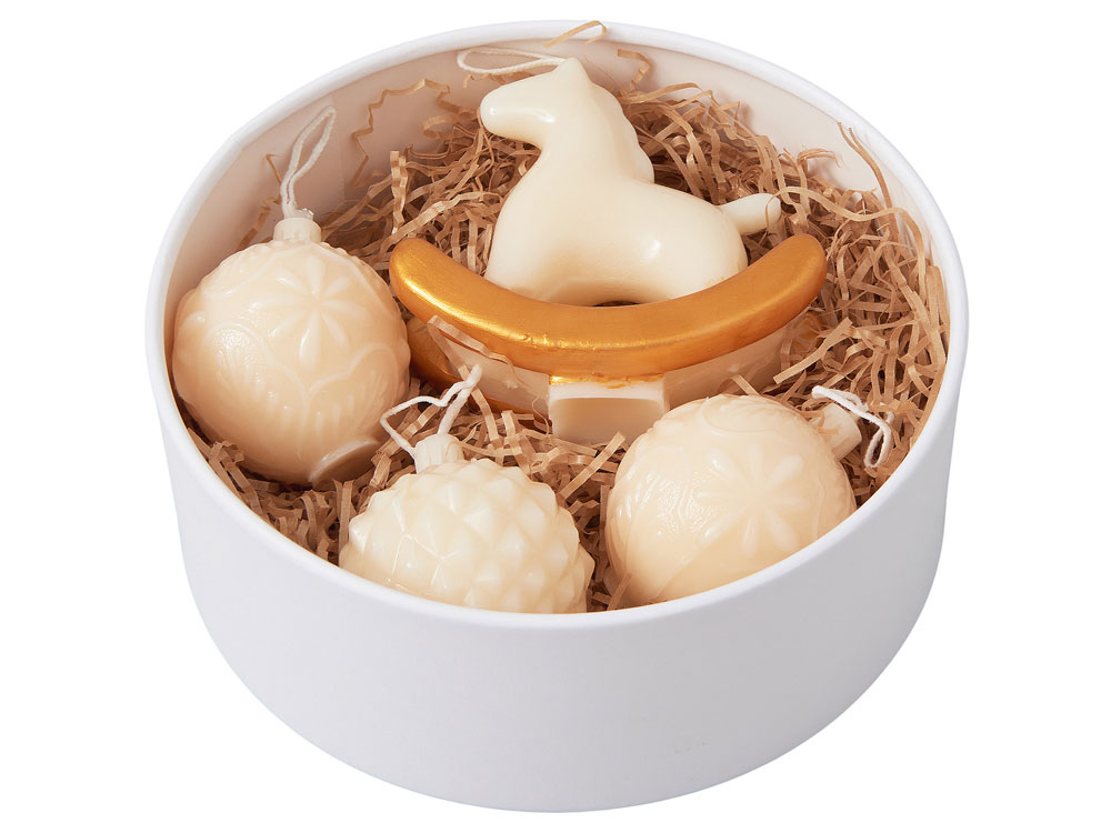 Набор свечей в подарочной коробке Noel - элегантный штрих к праздничному декору. В круглой коробке с крышкой — три свечи в форме новогодних шаров и одна в виде лошадки, выполненные из утончённой смеси кокосового, соевого воска и парафина. Свечи - без аромата, для чистого, мягкого свечения. Лаконичный дизайн и качественные материалы делают этот набор стильным подарком и изысканным украшением зимнего интерьера.
