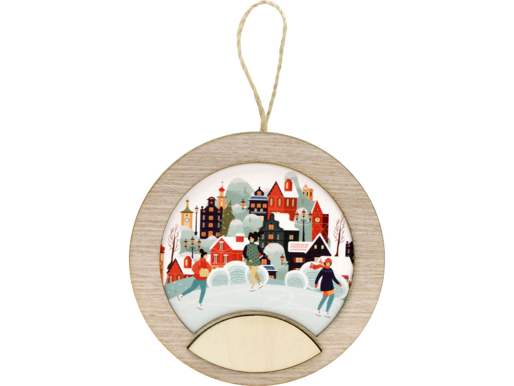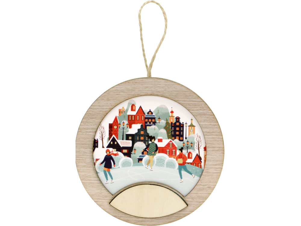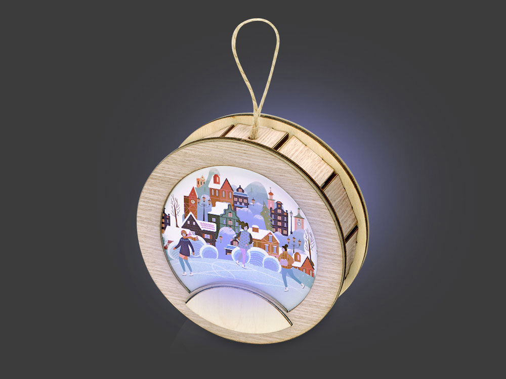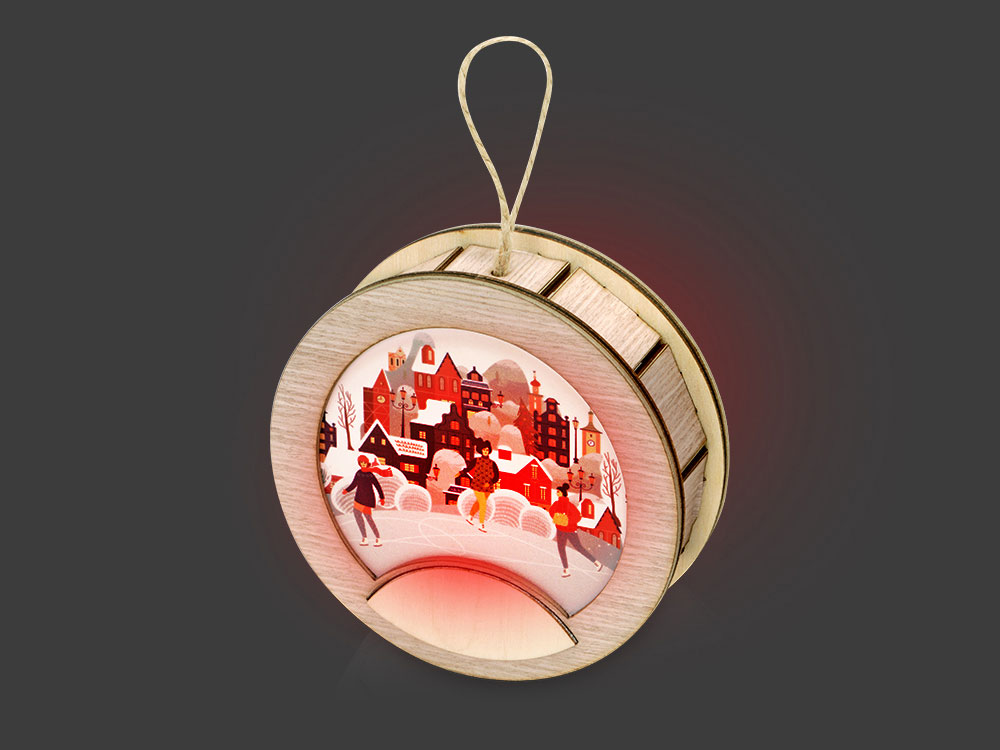 Новогодняя подвеска для елки станет прекрасным вариантом подарка: посмотрите, эти игрушки видно не только при свете дня, но и в темноте, ведь они могут светить сами! Игрушка с подсветкой выполнена из фанеры, фрагмент с изображением — напечатан на пропускающем свет материале. Подвеска сияет мягким разноцветным светом, подчеркивая пейзаж. Станет прекрасным вариантом для подарка, который будет радовать ваших адресатов долгие годы, каждую зиму красуясь на зеленых лапах елки.