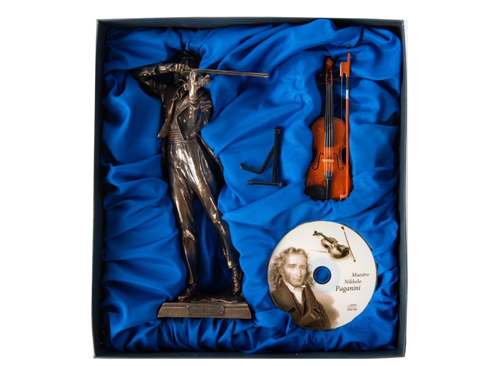 Набор Великий Паганини - это, наверное, самый необычный и в то же время запоминающийся подарок. В набор входят: миниатюрная скульптура, которая передает всю экспрессию, талант и вдохновение Маэстро; модель скрипки, которая является не просто муляжом - стоит к ее струнам прикоснуться смычком, и зазвучит очаровательная мелодия; CD-диск. Дарить такой набор стоит тем, кто, по Вашему мнению, достиг совершенства.