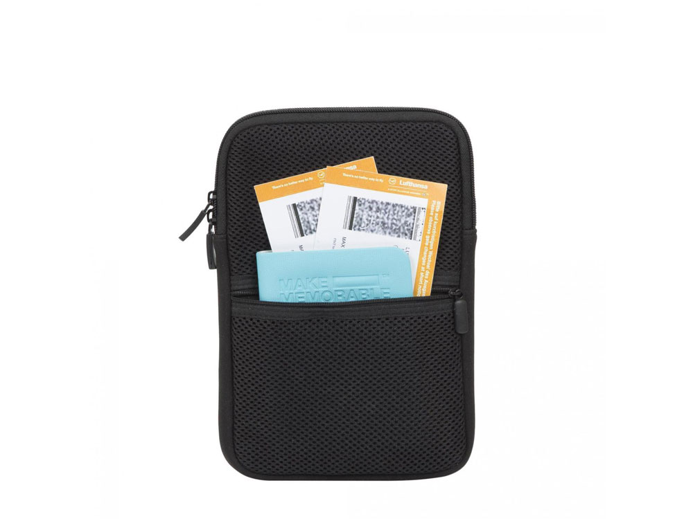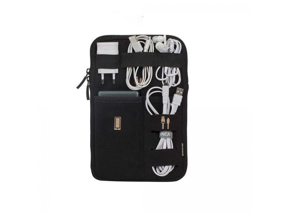 Чехол для планшета и хранения аксессуаров. Основное отделение подходит для большинства 7-8' планшетов 1 сетчатый карман на молнии для мелких предметов 1 внешний карман 1 внешний карман с петлями для кабелей 3 эластичные петли для кабелей Материал: неопрен, полиэстер Цвет: черный Внутренний размер: 155 x 230 x 20 мм. Внешний размер: 175 x 250 x 25 мм.