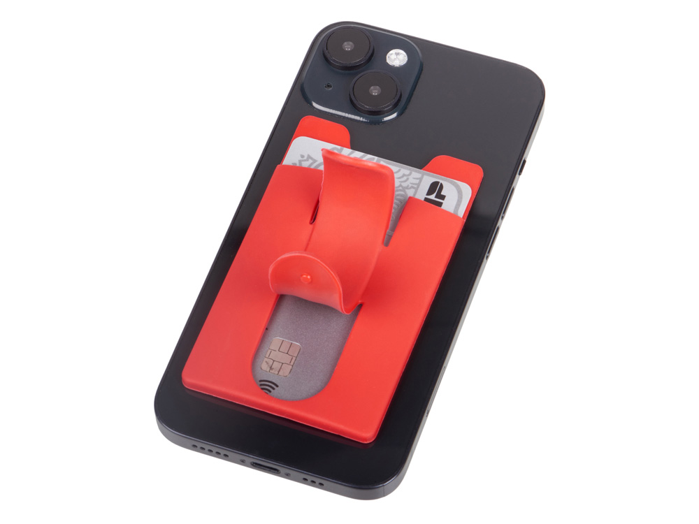 Чехол для визиток и кредитных карт с функцией подставки. За счет клейкой основы прикрепляется к обратной стороне телефона или любой другой плоской поверхности.