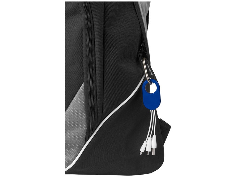 Кабель для зарядки 3-в-1. Кабель для зарядки Troop 3-в-1 с коннектором USB Type C и двойным совместимым коннектором 2-в-1 для устройств Apple® iOS и Android. Кабель оснащен карабином для удобного крепления к сумке. АБС-пластик.
