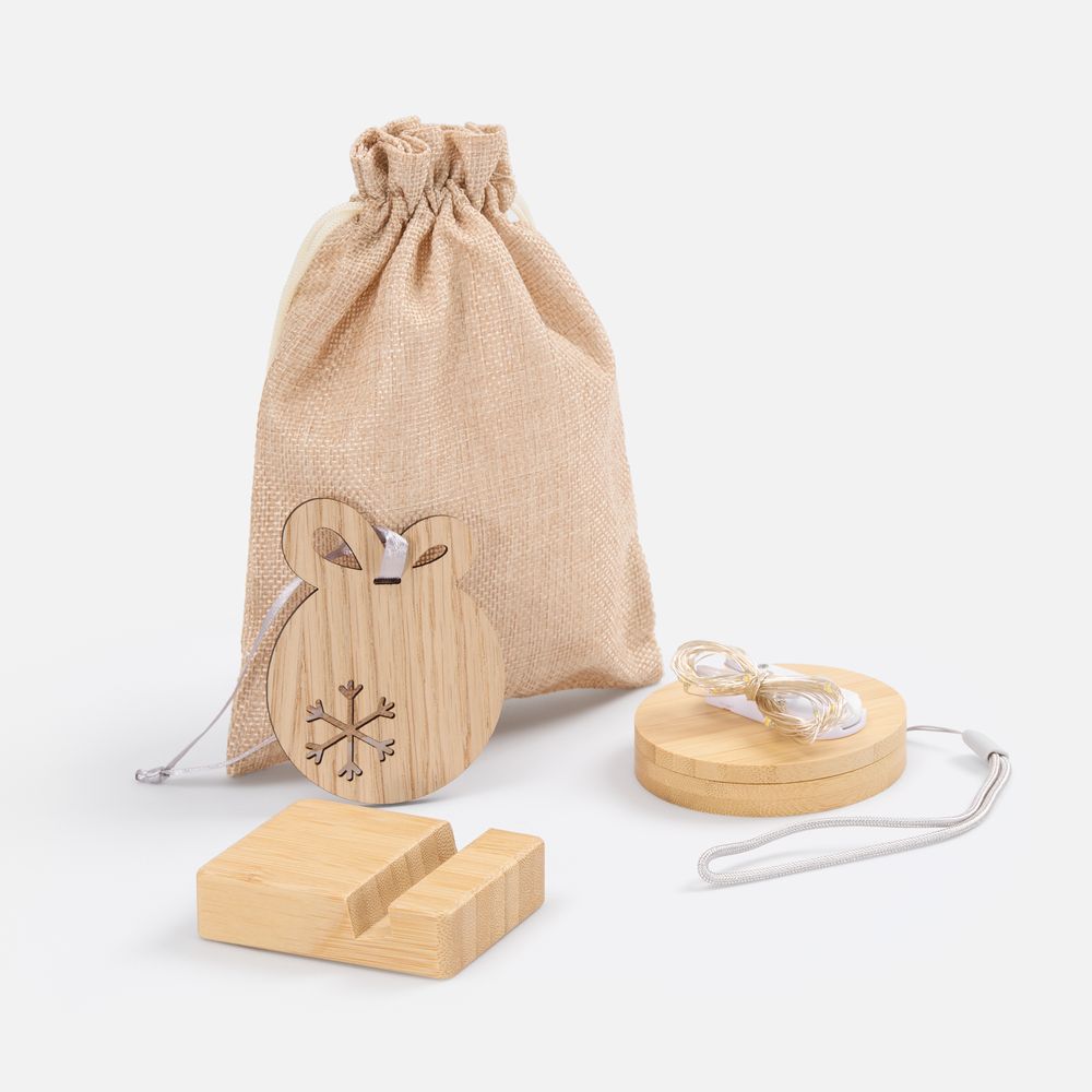 Woodward — миниатюрный подарочный набор, изящно сочетающий в себе экологичность с технологичностью. В небольшом холщовом мешочке уместились полезные аксессуары для основных гаджетов, а также, конечно, нашлось место и для приятных новогодних атрибутов. Большинство изделий изготовлено из дерева, что добавляет набору привлекательности.
