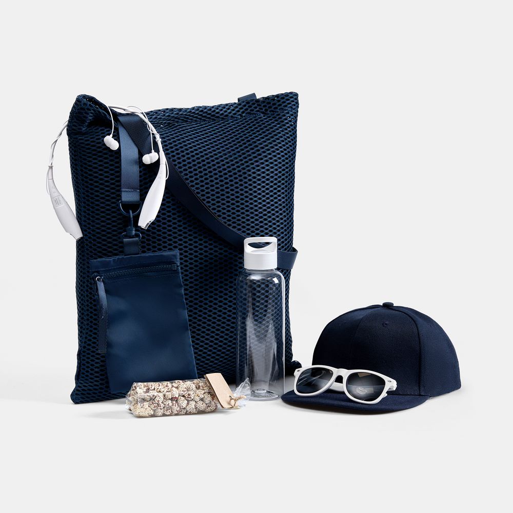 - Материал: шопер - полиэстер, твил 290D с полиуретановой пропиткой; трехслойная сетка; наушники, очки - пластик; бейсболка - полиэстер 100%, плотность 300 г/м²; бутылка - пластик, ПЭТ