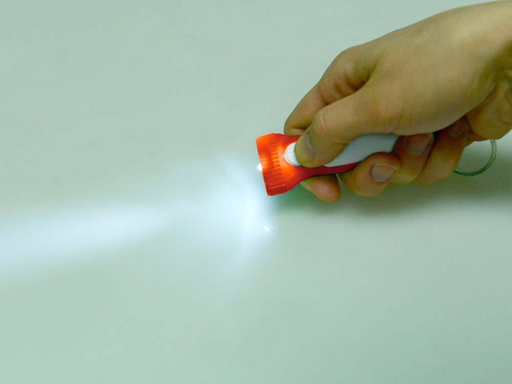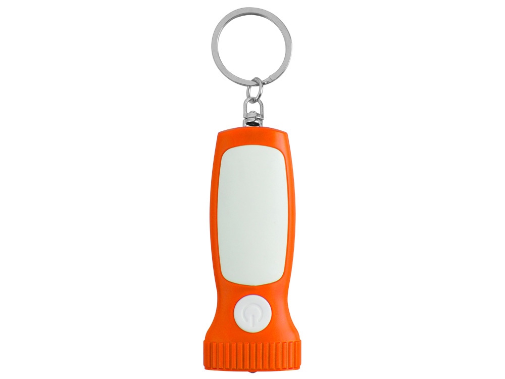 Яркий брелок со встроенным фонариком. Плоская форма и большая ручка с белой вставкой делает брелок удобным для нанесения логотипа.