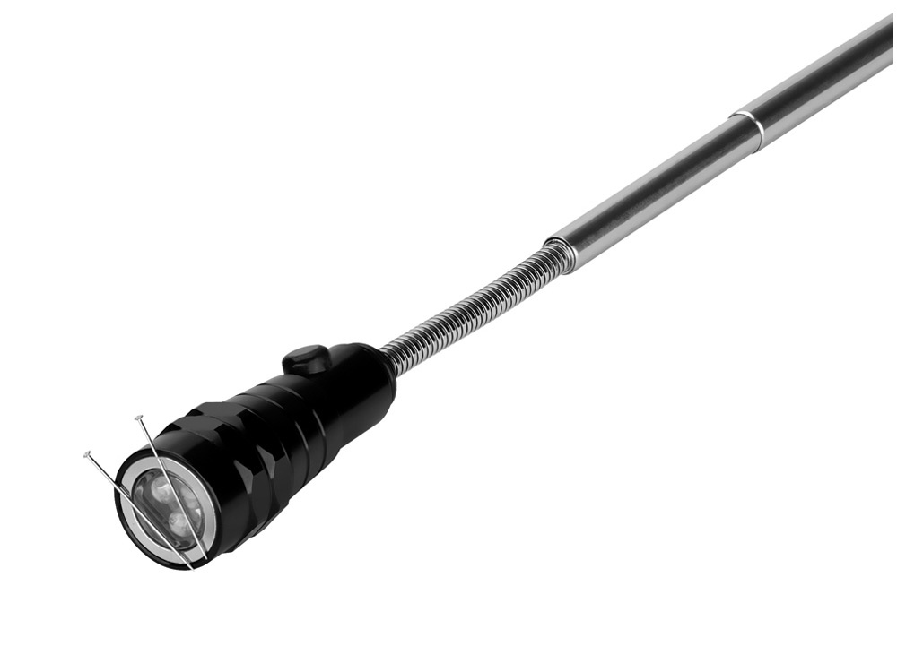 Магнитный телескопический фонарь. Удобный инструмент на телескопической ручке. Можно легко найти металлические маленькие предметы даже в темноте. В развернутом состоянии длина фонаря достигает максимально 57 см. Работает около 4-5 часов, в комплекте 4 батарейки ЛР44.